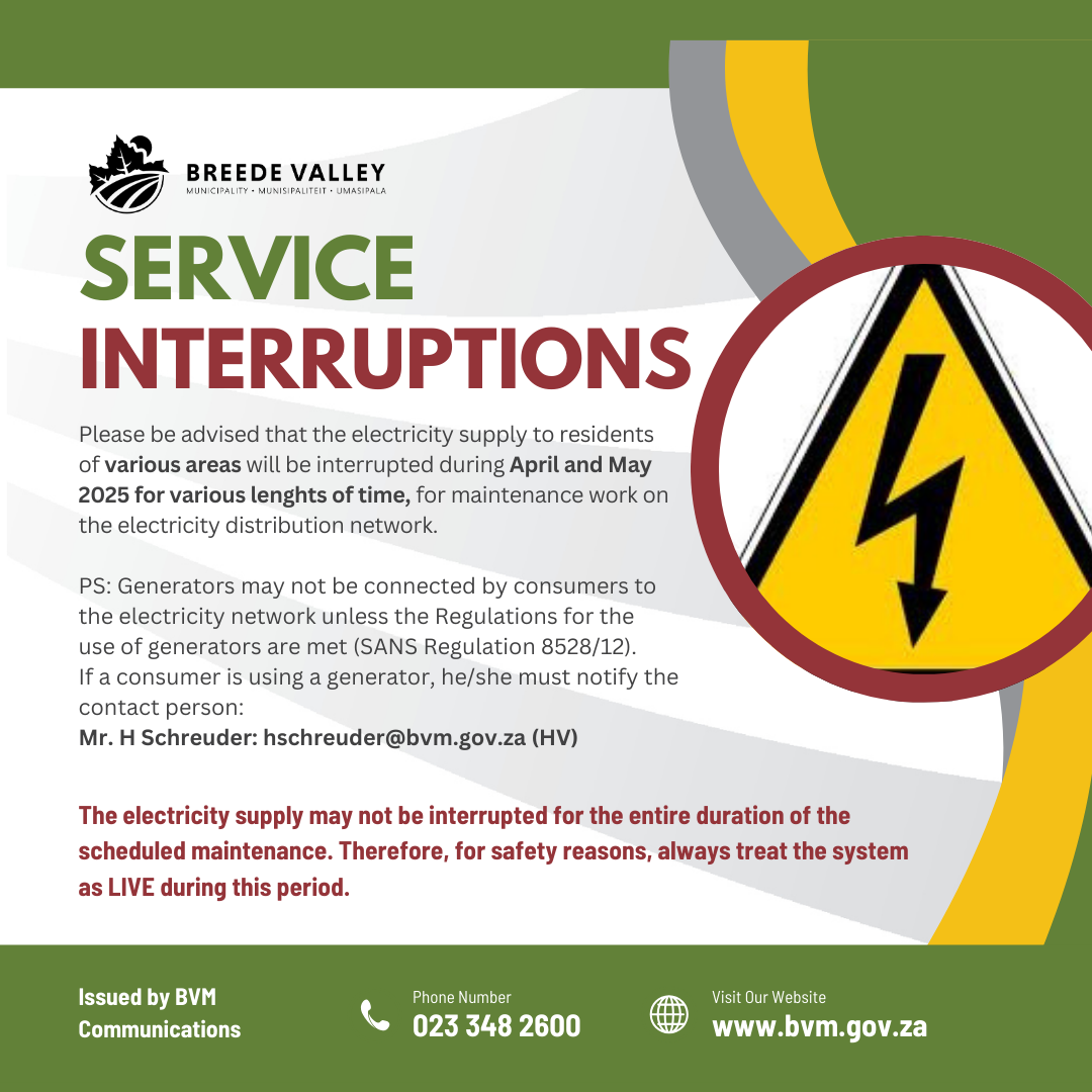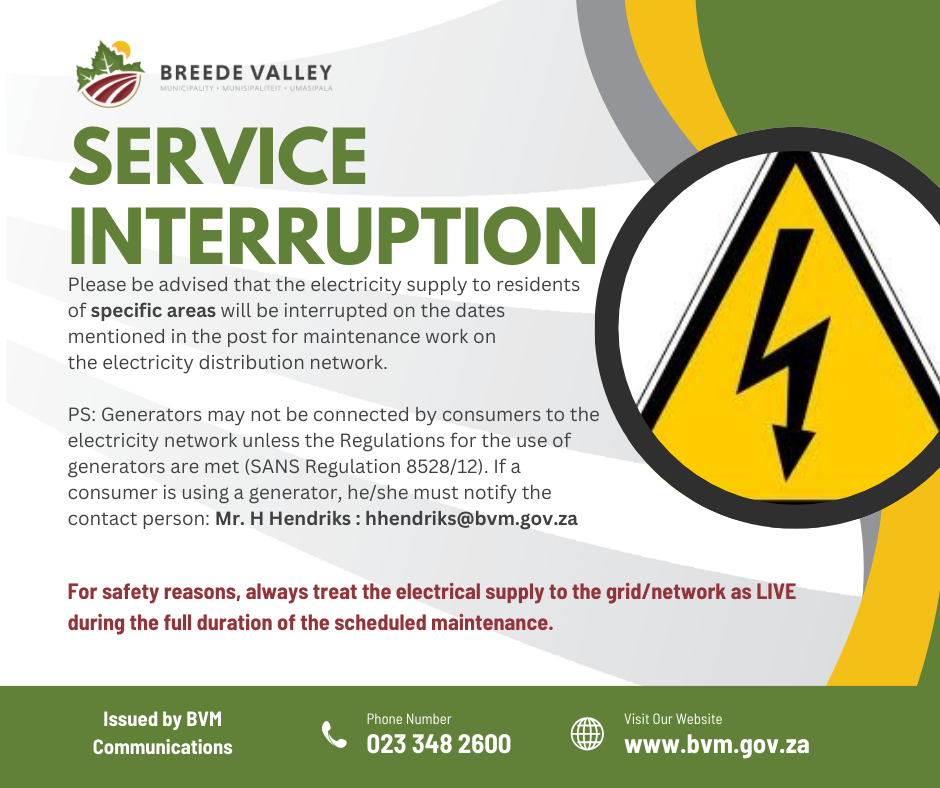 ONDERBREKING VAN ELEKTRIESE TOEVOER Hiermee word u in kennis gestel dat die elektrisiteitstoevoer onderbreek sal word soos hierbo genoem of in die dokument hierby aangeheg ten einde dringende instandhoudingswerk uit te voer aan die elektrisiteitsverspreidingsnetwerk. Geen versekering kan gegee word dat die elektrisiteitstoevoer vir die volle tydsduur af sal wees nie, u moet dit dus …