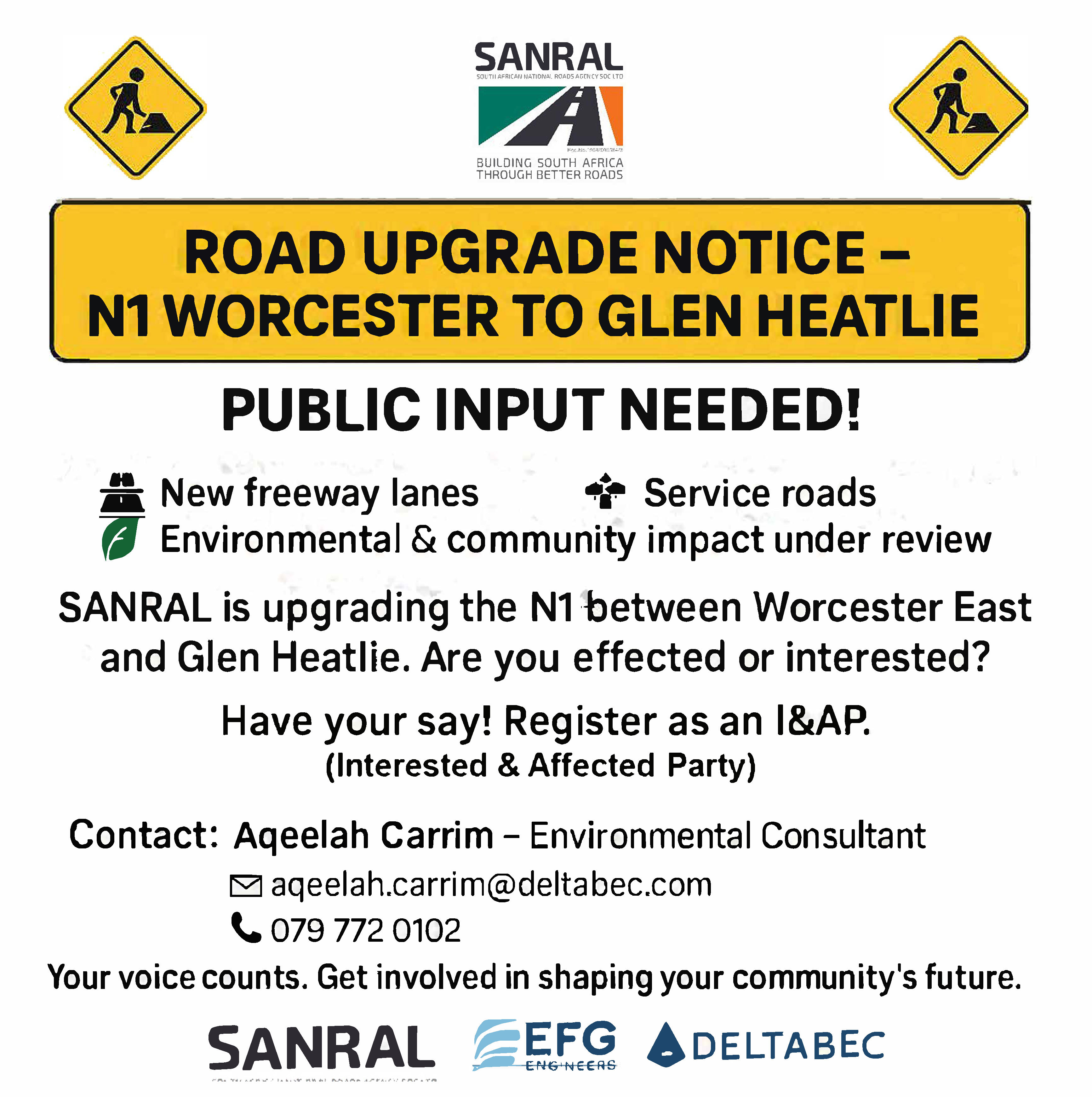 ππππππ πππππππππππππ ππππππππππ: ππππ πππππππ πππππππ πππππππππ ππππ & ππππ πππππππ SANRAL, through EFG Engineers and Delta Built Environment Consultants, is proposing upgrades to a 10.5 km stretch of the N1 (Section 3) between Worcester East (km 3.50) and Glen Heatlie (km 14.00). Upgrades include: β’ Widening and realignment of the N1 β’ Construction of …