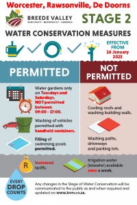 The Hex Valley Water Users Association informed BVM of planned maintenance from 3 – 17 June 2024. During this period, the raw water supply to the water treatment works will be reduced by 50%, and subsequently, BVM will only receive and treat half the usual volume of water. Water restrictions will be implemented, and residents of De Doorns are urged to limit water use by 50%. BVM will close the reservoirs from 21:00 – 5:00 daily to build up reserves. Thank you for your cooperation.