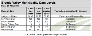 The reservoir levels are decreasing fast, with only 50% of raw water entering the treatment works. BVM is struggling to stabilize the reservoir levels and urges residents of De Doorns to limit water use and drastically prevent water wastage. The low reservoir levels will force BVM to close reservoirs earlier and open them later for the next week.